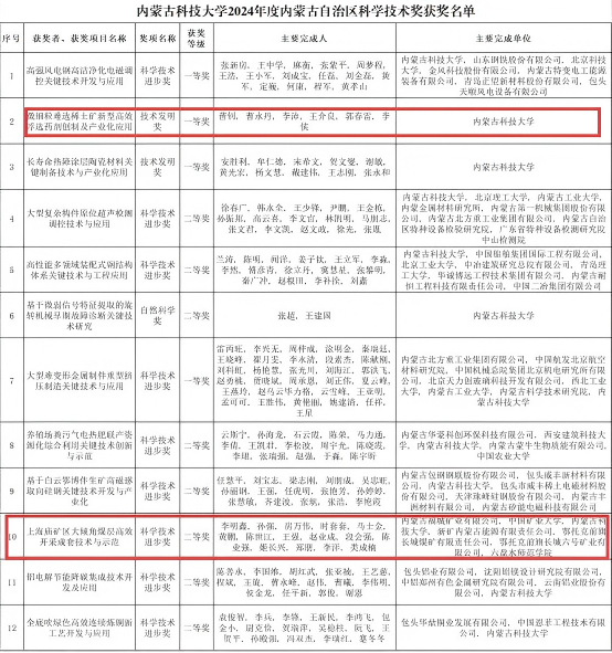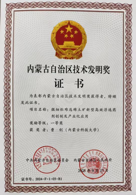 11月27日,2024年度内蒙古自治区科学技术奖励大会在呼和浩特市召开,表彰为全区科技进步和高质量发展作出突出贡献的科技工作者。大会公布了2024年度自治区科学技术奖获奖名单,球友会员工参与的多项成果荣获自治区科学技术奖,曹钊教授团队的“微细粒难选稀土矿新型高效浮选药剂创制及产业化应用”获得技术发明奖一等奖,段会强老师参与“上海庙矿区大倾角煤层高效开采成套技术与示范”获得科学技术进步二等奖。